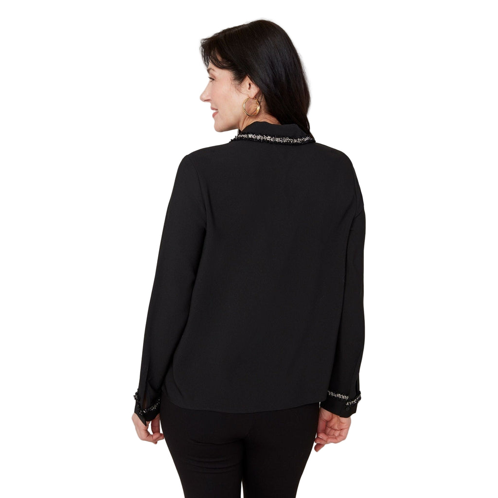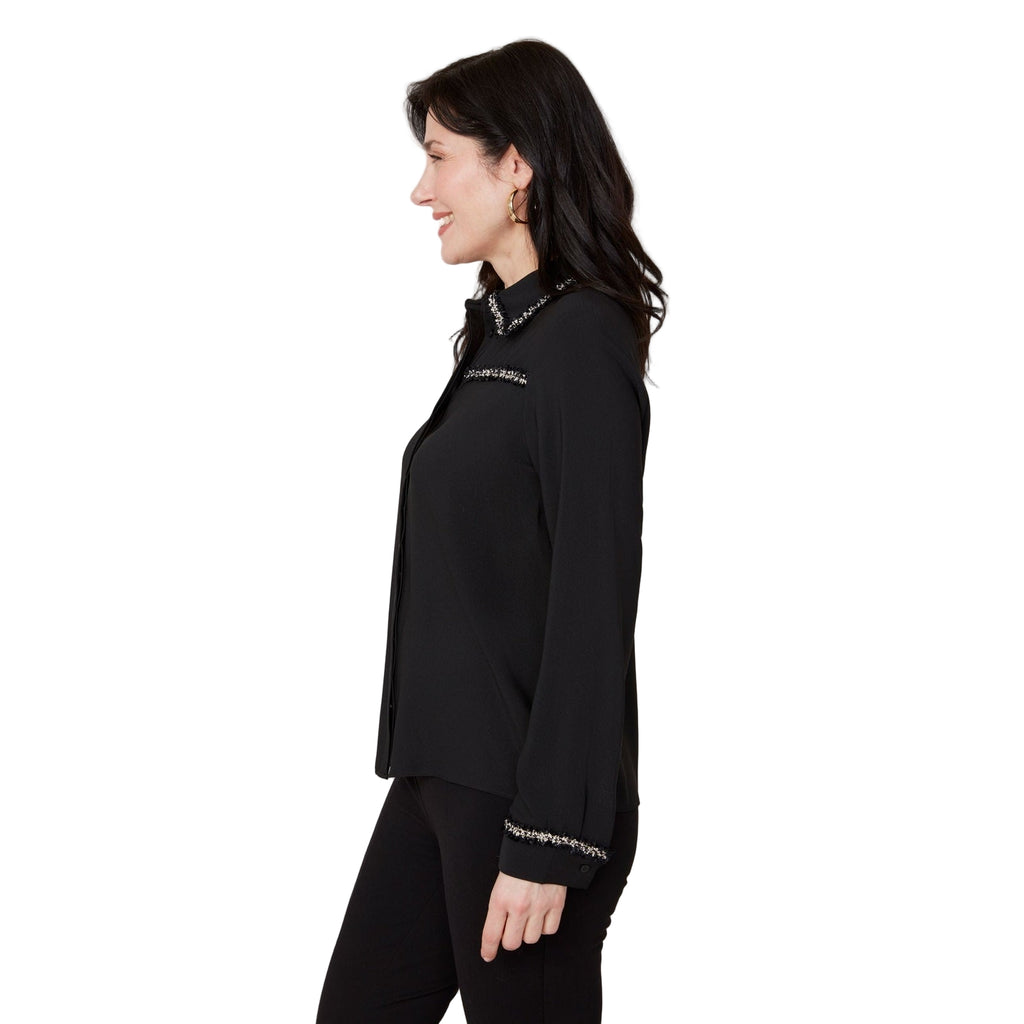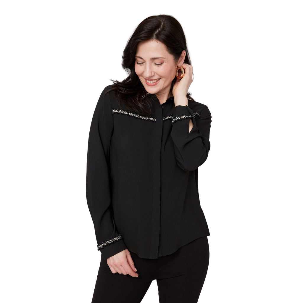 Featuring delicate trim accents along the chest and cuffs, a hidden button placket, and long sleeves, this blouse is both understated and sophisticated. Pair it with trousers for a professional look or style it with denim for an effortless finish.