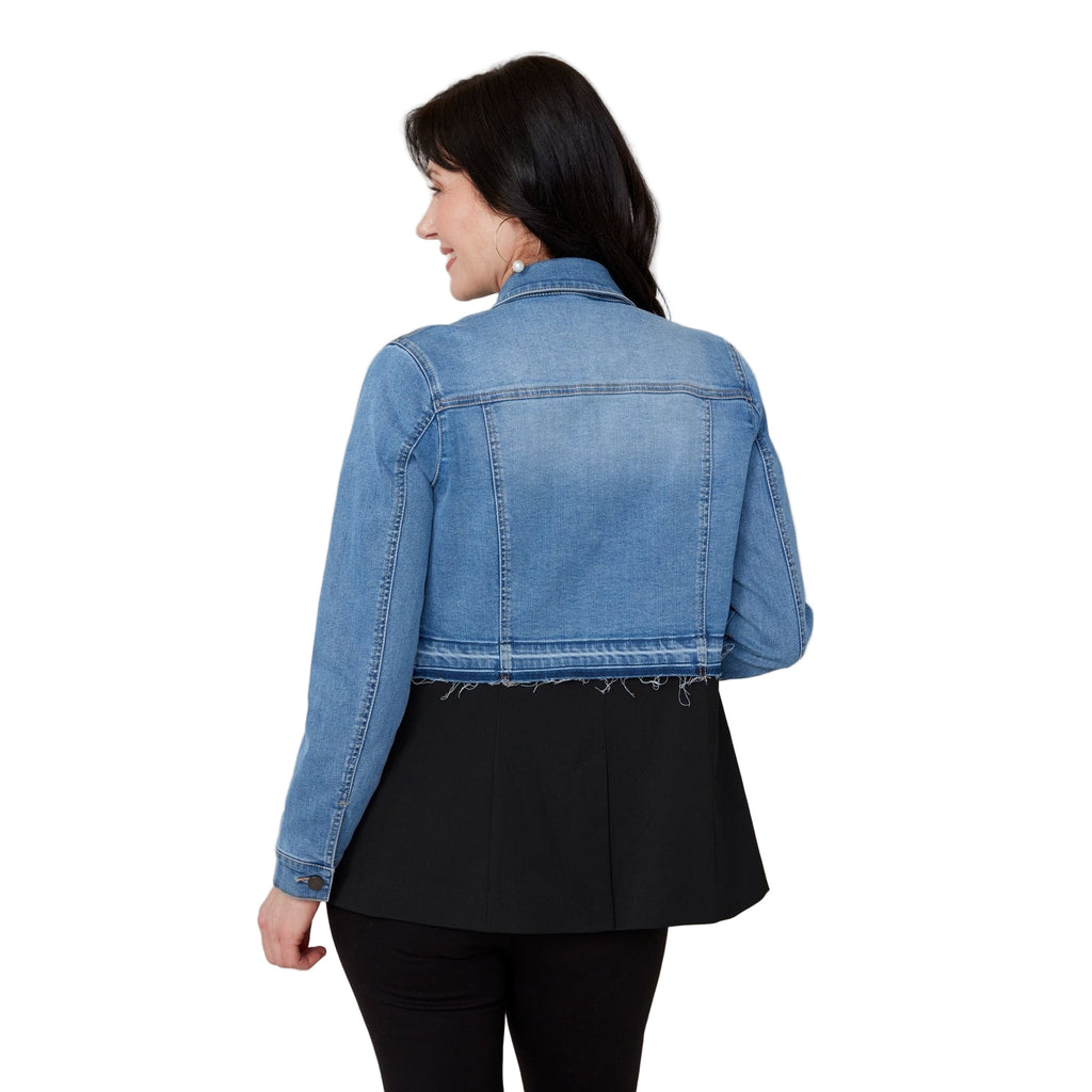 The Shiloh Mixed Media Denim Jacket brings a modern twist to a timeless classic. Featuring a cropped denim layer paired with sleek contrast panels, this jacket delivers the perfect mix of edgy and chic.