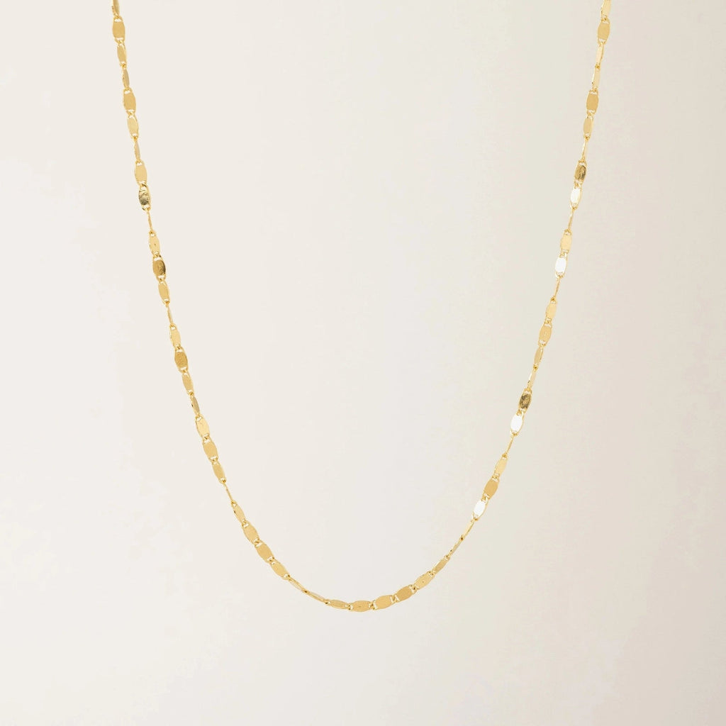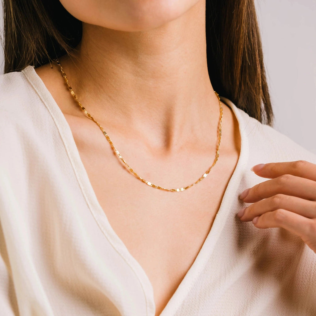 A delicate necklace that shines bright on its own and plays well with others if you want to layer up. Now you just have to choose: gold or silver?