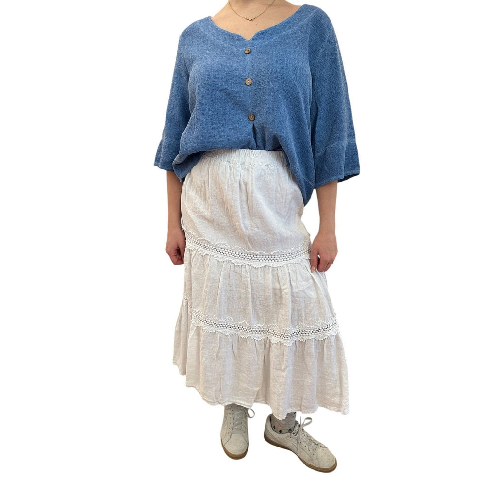 Light, feminine, and full of movement. This linen tiered skirt flows effortlessly with every step, while delicate lace accents add a romantic boutique touch. Designed for comfort and breathability, it’s perfect for warm days, vacations, or styled with knits during transitional seasons.
